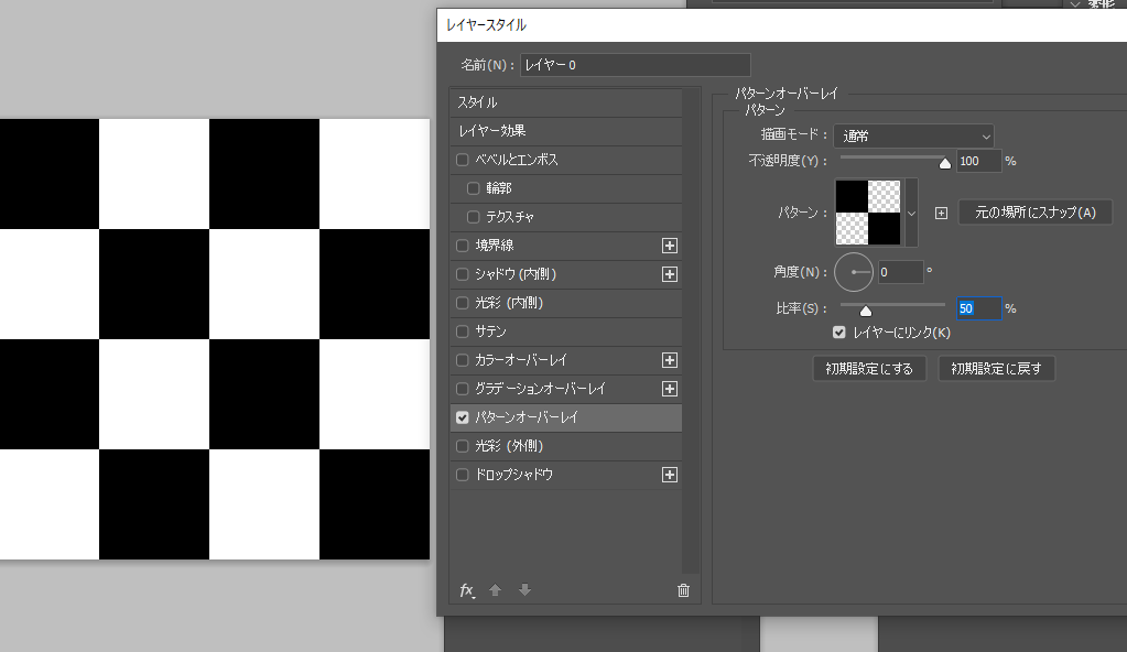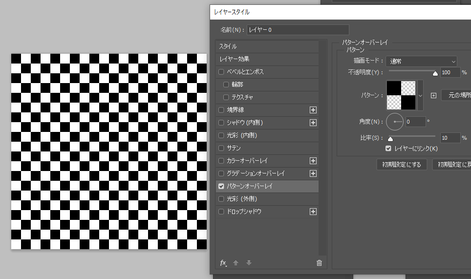 そしてレイヤーをまたダブルクリック、レイヤースタイルが表示されるので、「パターンオーバーレイ」を選択します。すると白紙のレイヤーに先ほど定義したパターンで模様がつきます。
