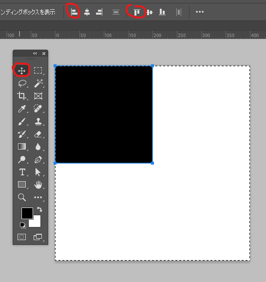 移動ツール(V)にしてからctrl+Aでキャンバスを全選択、そして上部の整列ツールを使うと簡単に上隅配置ができます。