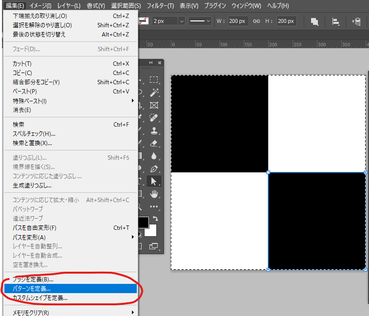 上部メニュー「ウィンドウ」から「パターン」を呼び出します。