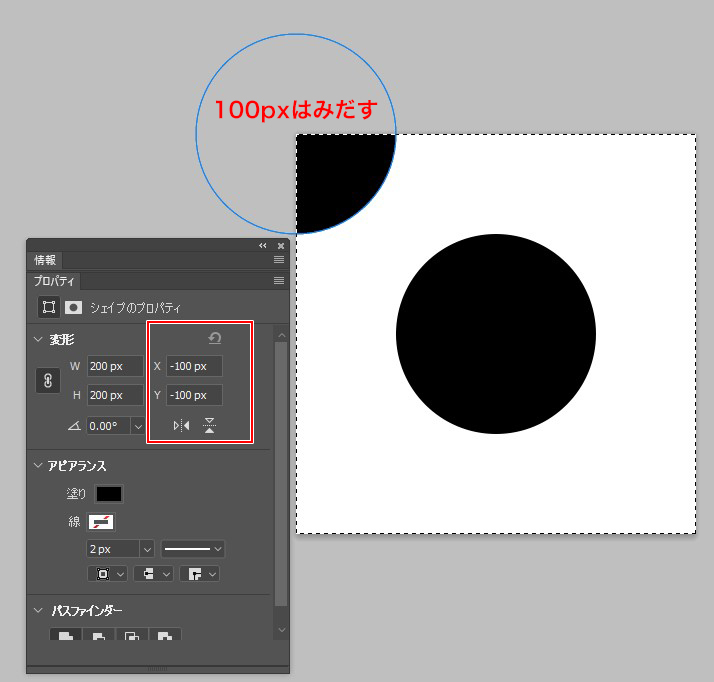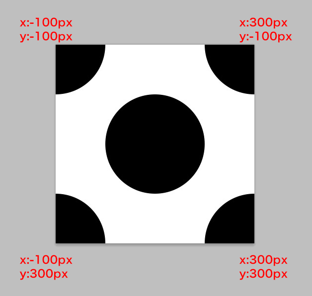 そしてctrl+Jで丸レイヤーを複製後、丸のオブジェクトを上隅から100px(半径分)はみだして配置します。