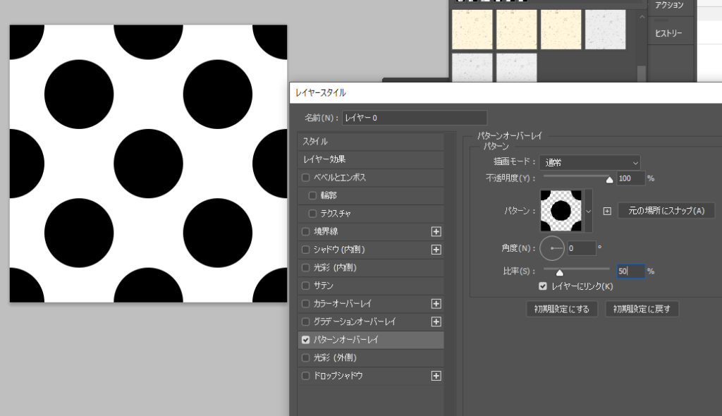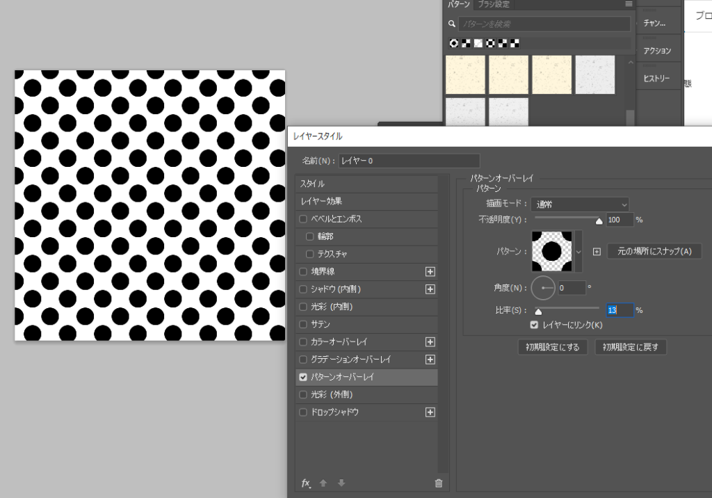 そしてレイヤーをまたダブルクリック、レイヤースタイルが表示されるので、「パターンオーバーレイ」を選択します。すると白紙のレイヤーに先ほど定義したパターンで模様がつきます。