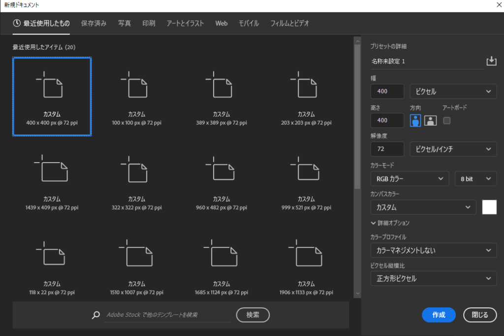 ここでは「幅400×400px」で作ります。