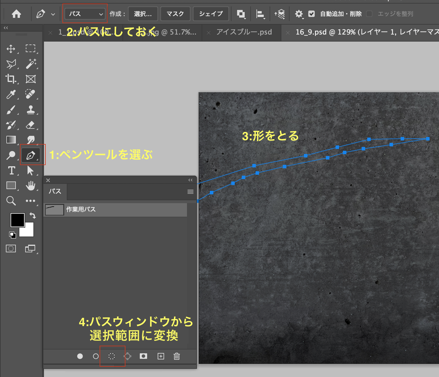 ペンツールでとった形をパスウィンドウで選択範囲に変換します。