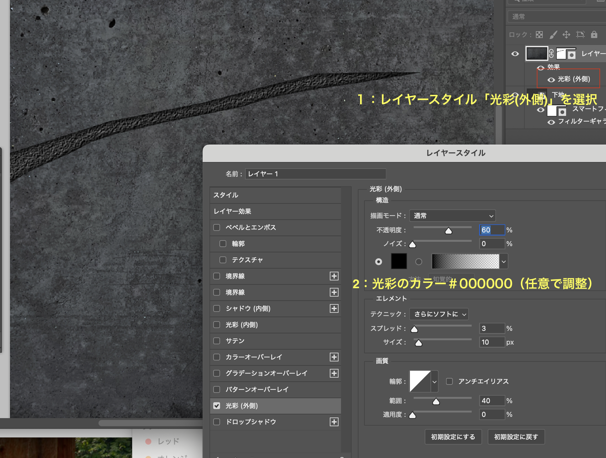 なので、ここで壁紙にレイヤースタイル「光彩(外側)」を追加します。