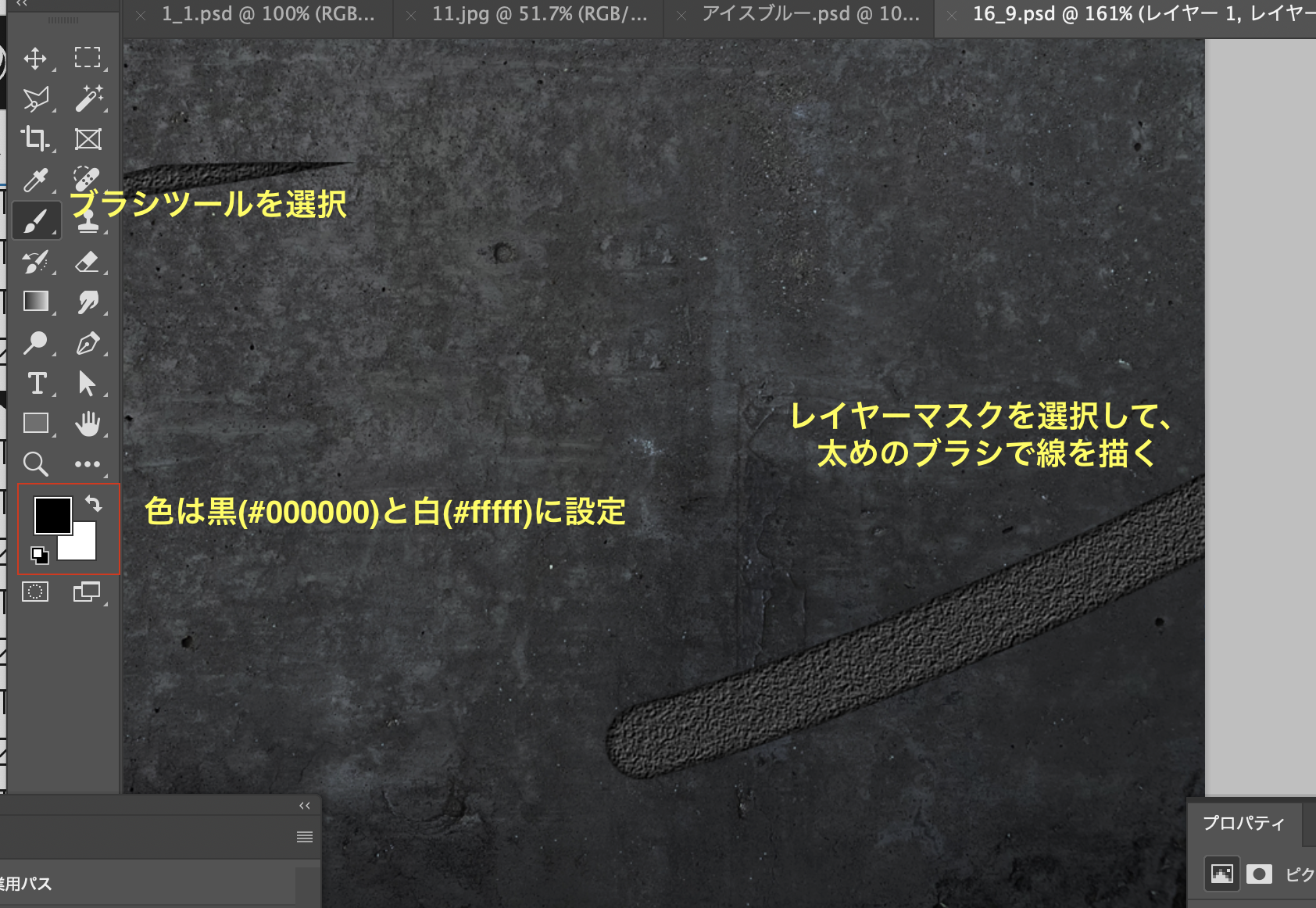 レイヤーマスクが選択された状態で、太めの黒のブラシで線を書きます。