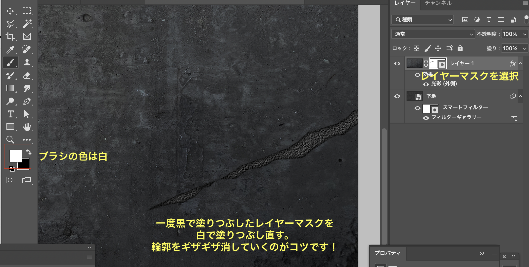 やり方はレイヤーマスクを使い、画像の一部を黒で塗りつぶしていく方法でひびを作っていきます。